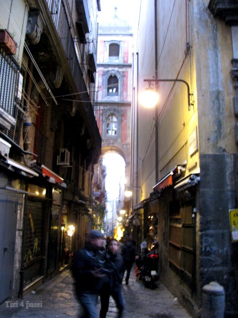 Il nostro hotel si affacciava su piazza del Gesù Nuovo, a circa metà della strada. Abbiamo percorso parecchie volte la strada, comoda per raggiungere i luoghi più interessanti. Quando ci siamo inoltrati la prima impressione è stata di sorpresa, una via così non l’avevo mai vista. Poi, ho cominciato ad osservare, a scrutare meglio. Ad ogni angolo, ci sono mille interrogativi, vorresti sapere di quel palazzo che in epoche migliori si ergeva fiero nel suo splendore, ti lasci incuriosire da quel cortile interno che ti ha sorpreso quando ci hai sbirciato dentro, sorridi quando entri in un negozio per acquistare un taccuino e ci trovi un po’di tutto, ti intenerisci alla visione di una cappelletta dedicata alla Madonna