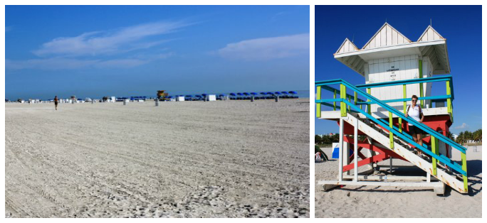 All’alba arriviamo a Port Everglades dove termina il primo giro della crociera. Prima di entrare in porto abbiamo ammirato lo spettacolo di luci dei grattacieli di Miami e le navi tutte illuminate per la notte. Una volta fatta colazione, in camera, scendiamo tra i primi e con altri due ragazzi abbiamo condiviso untaxi per Miami Beach, il costo totale della corsa è stata di 100 dollari, non poco ma la distanza non era breve. La spiaggia è immensa, costeggiata da una pista ciclabile con tantissime persone che correvano a piedi di prima mattina.