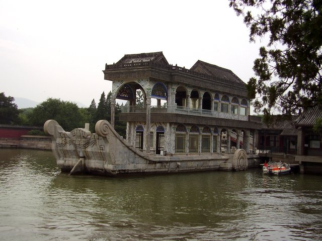 Mi colpisce una barca di marmo, fintamente attraccata al molo con la prua verso il centro del lago pronta per partire. Probabilmente nata per scherzo è rimasta a testimoniare l’immobilismo ed il declino della corte manciù.