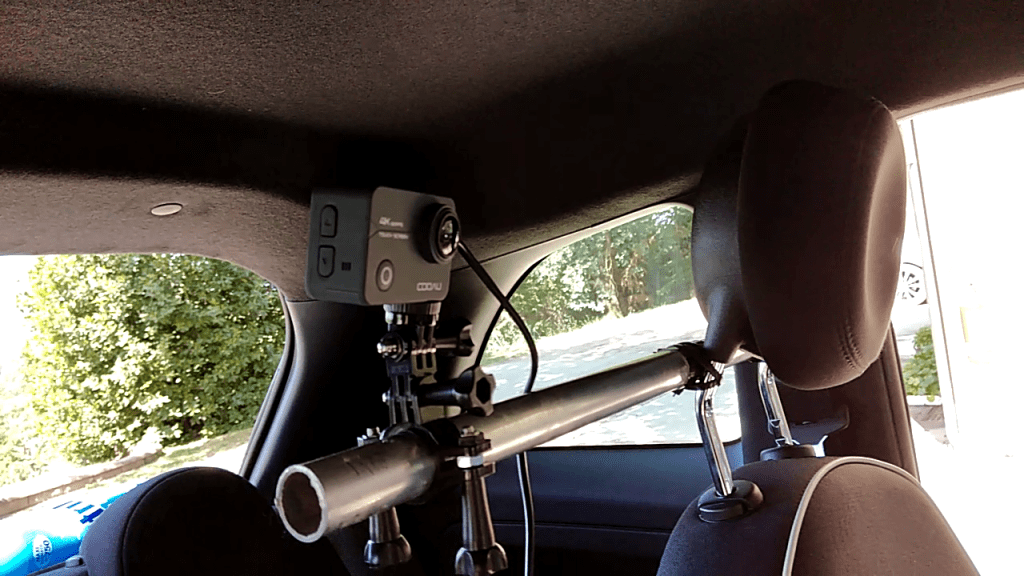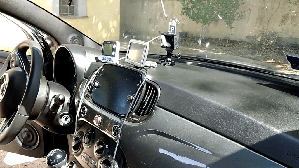 Come dotazione tecnologica di bordo, abbiamo innanzitutto allestito due action cam e ci siamo premuniti di ben 10 micro sd da 128 GB per poter riprendere per intero tutta la tratta da Roma a Capo Nord. Una action cam era posizionata sul cruscotto, in modo che potesse riprendere la strada e il paesaggio circostante, mentre la seconda action cam era posizionata dietro di noi in mezzo tra i due sedili, ancorata con un tubo al poggiatesta del sedile pilota. Questa riprendeva continuamente il contachilometri e il computer di bordo del cinquino, nonché il cronometro (un normalissimo timer da cucina) e il navigatore, un Tom Tom di 10/12 anni fa (nemmeno Alessandro si ricorda più) che però ha svolto egregiamente il suo lavoro.