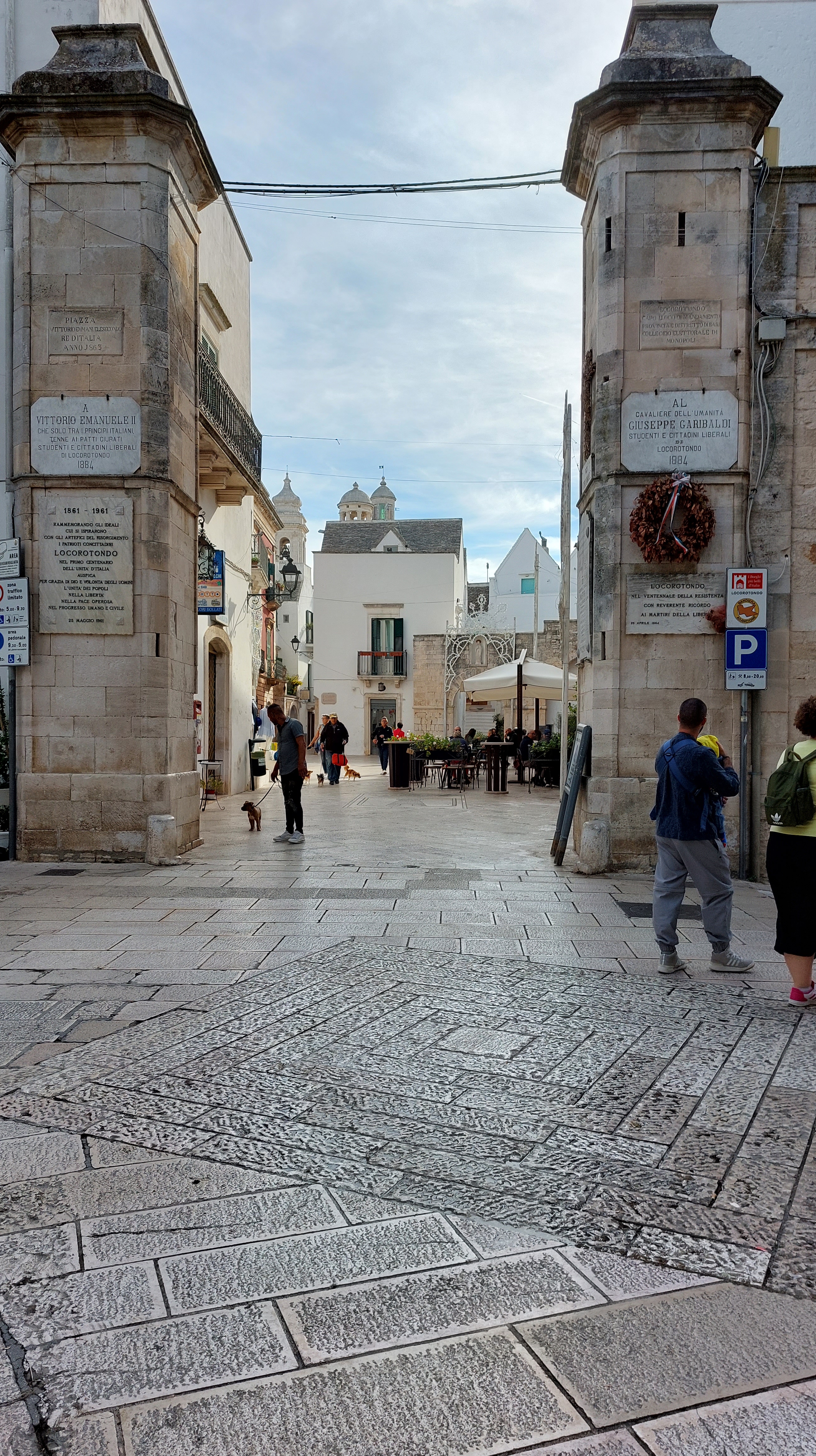 Arriviamo relativamente presto in visita alla città, lasciamo l’auto in una via comoda e poi a piedi risaliamo Corso XX Settembre che ci porta all’entrata della città vecchia. Su in cima possiamo ammirare un bel panorama dal belvedere, un altro punto di vista sulla Valle, sul lato opposto della strada un ingresso commemorativo ci invita ad entrare. Il borgo rotondo è chiamato U Curdunn dagli abitanti e la sua tipicità sta nelle sue case chiamate Cummerse, i tetti sono spioventi e sono ricoperti dalle chiancarelle, lastre calcaree provenienti dalle zone circostanti poste a secco sulla sommità della struttura. Generalmente le case tipiche in questa regione sono i trulli, oppure costruzioni con i tetti piatti, a Locorotondo viene adottato anche questo tipo di copertura dal tetto spiovente utile per la raccolta delle acque piovane.