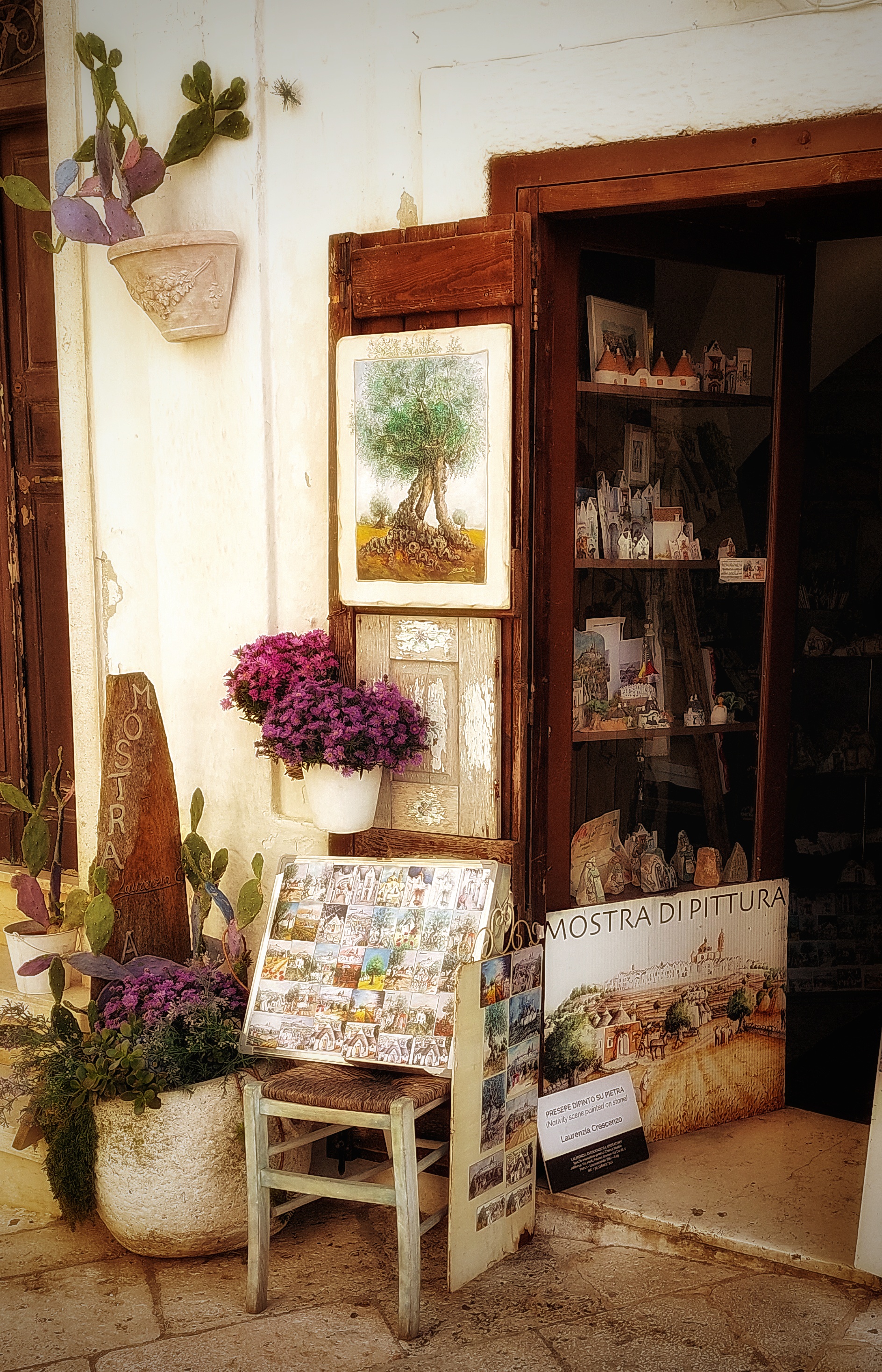 Mentre ammiriamo il panorama incontriamo una signora con la quale scambiamo un saluto. Chiediamo un’informazione e da lì inizia una bella chiacchierata, scopriamo come avviene la raccolta delle olive e altro ancora. La signora ha un bel sorriso gentile, parla volentieri, a un certo punto ci fa cenno di seguirla, indica un punto in lontananza dicendo che da quella parte c’è Locorotondo. Ci porta a conoscenza che sua figlia è una pittrice e ha un laboratorio in città. La nostra visita era programmata proprio per il giorno seguente e lei ci chiede di portare i suoi saluti alla figlia. Non potevamo far altro che accogliere la sua tenera richiesta.