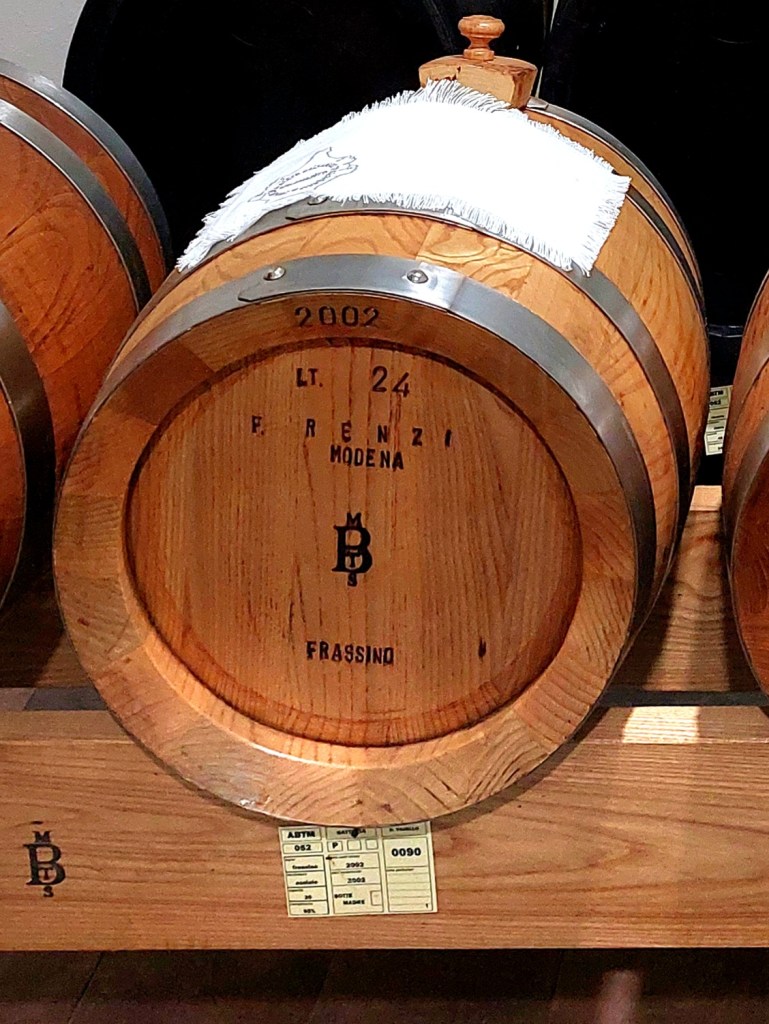 Si passa alle sale adiacenti che custodiscono botticelle di più recente produzione affiancate a quelle più datate, un delicato e inconfondibile aroma di aceto balsamico è nell’aria. Ogni botticella riporta alcune informazioni tra le quali: la data, l’identificazione alfanumerica, i litri contenuti, il nome del committente, il tipo di legno usato (elemento importante perché ogni tipo di legno utilizzato rilascia all’aceto note aromatiche diverse). Le piccole botti sono costruite seguendo una procedura che non è cambiata nel tempo, prevede l’uso di legni nobili essiccati in modo naturale e di fasce in acciaio che devono abbracciare saldamente le assi curve affinché “neppure una lacrima del prezioso prodotto possa andare perduta”.