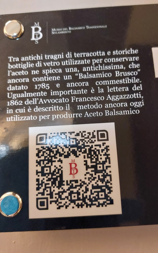Infine si passa alle ultime sale in fondo al corridoio. Qui sono custodite ampolle, bottiglie, testi che ci raccontano la strada percorsa dall’aceto nella storia. Tra i tanti troviamo anche un prezioso messaggero del passato, una bottiglia che contiene ancora quello che è definito “Aceto Balsamico Brusco” del 1785 (pare ancora commestibile). La mia visita si conclude. E’ così, il nostro Paese è una continua scoperta.